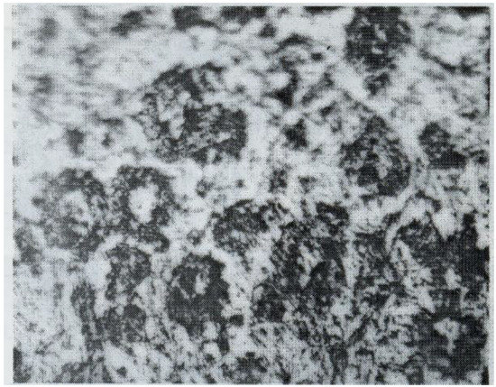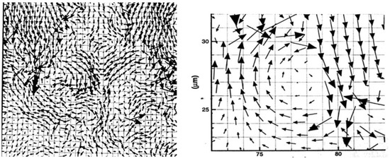 Thus, for the occurrence of rotational motions, the presence of spatially correlated motions is necessary when finite volumes of a medium of any nature move as solid bodies with different shift velocities. In Figure 6, the rotation cells in shock-deformed copper obtained by simulation are presented [25]. In Figure 7, the experimentally observed rotation cells are provided for comparison.