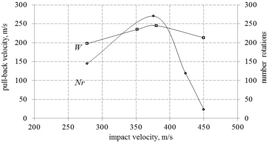 The dynamic strength of material strongly depends on the density of rotational cells. In Figure 8, the experimentally obtained dependencies of spall strength and density of rotational cells on the impact velocity are presented. Both dependencies are non-monotonous, and the spall strength maximum coincides with the maximum of rotational cells’ density.
