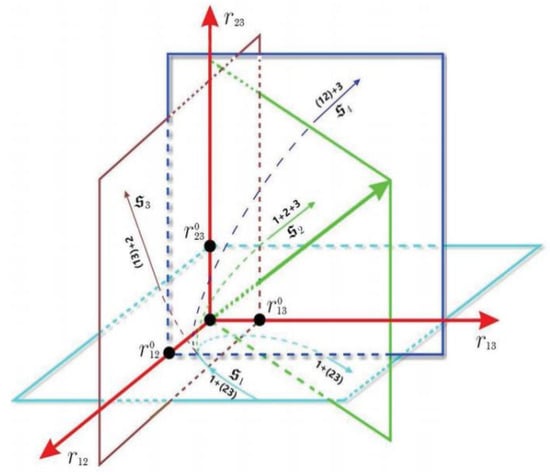To study this question, we recently considered the multichannel scattering in a three-body system (see diagram in Figure 1), formulating it in a conformal Euclidean–Riemannian space associated with the potential energy surface of the system of interacting bodies [5]. The developed representation made it possible to identify two new hidden symmetries of the internal motion of a three-body system and thereby reduce the number of equations of motion to six instead of the usual eight. Note that when moving to a local reference system, a new parameter of the chronologization of the phases of motion of the dynamical system “s” appears in the problem. This parameter, as we will see below, in the global coordinate system (where is the chronolization parameter in the global coordinate system) actually represents the trajectory of the center of mass of the three-body system in the three-dimensional configuration space, which we will further call internal time. It is obvious that the internal time will be multidimensional, non-uniform and oriented, whereas in classical mechanics the time “t” has an absolute value and does not depend on the processes occurring in the system.