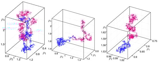 Internal time of three particles for three different initial data on two different complete terms of the manifolds and . On the plots, blue and red colors indicate internal times that were calculated on the manifolds and , respectively. Each point of internal time, if projected onto the coordinate axes, determines the configuration of three particles at a given moment.