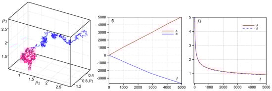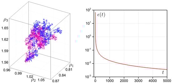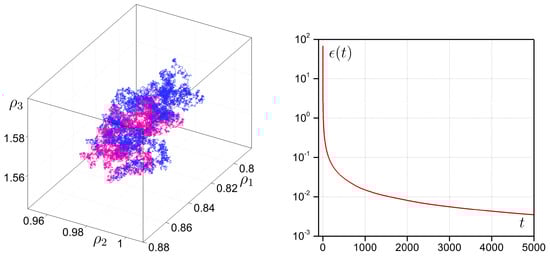 Using the data from the third row of Table 2, we calculated the internal time on the families of manifolds and (see Figure 10). As can be seen from the second figure, internal time as a function of ordinary time is a monotonic function in both cases considered, however, as numerical calculations show, non-monotonic dependencies are also possible, in the case of other initial data. In the third figure on the left, the dimension of fractal structures filling the three-dimensional space of two internal times is calculated. It is shown that the dimension of both structures tends to its limiting asymptotic value at .