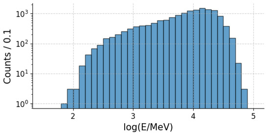 As depicted in Figure 1, the actual values of the total energy released span several orders of magnitude, from hundreds of MeVs to hundreds of GeVs. Directly regressing them would, thus, be too challenging a task. To circumvent the problem, we applied a nonlinear transformation and selected the logarithm in base 10 of the energy expressed in MeV as the objective of the regression.