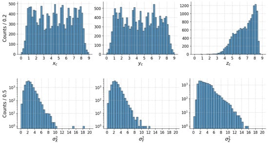 Distributions of the energy deposition centroid (above) and energy dispersion (below) across the whole dataset. The variables are expressed in “cell lengths”.