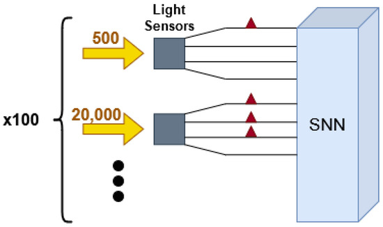 Incoming data need to be converted into a series of spikes, i.e., a spike train, before being fed into the network. We adopted the following encoding scheme, graphically represented in Figure 3. For each sensor, we consider four different channels that go out of it and into the network. In each time step, these channels can either be activated and carry a spike or be inactive, depending on the amount of light received in that instant. Each channel has a different activation threshold, so spikes will carry information about both the timing and intensity of the interactions. The exact formula used is the following: