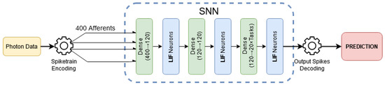 Concerning the above assumptions, in particular, the 100% efficiency of light collection, it is important to point out that the goal of this study is not to model all detector physics in detail but rather to evaluate whether useful topological information can be extracted from the temporal structure of light emission. The assumption of perfect light yield removes hardware-dependent inefficiencies and allows for a clear focus on algorithmic performance. In a real experimental setup, the efficiency of light production is usually determined through calibration measurements, and systematic corrections can be applied to account for realistic light yield inefficiencies. Thus, this assumption does not invalidate the feasibility of the approach. Any systematic bias introduced by this assumption would be absorbed in the learned parameters of the SNN. If needed, the network can be retrained later with realistic efficiency factors.