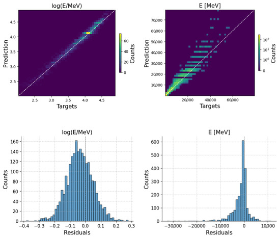 Output of the network and the respective results for the true value of the energy (in MeV). The plots show the correlation between targets and predictions (above) and the residuals (below).