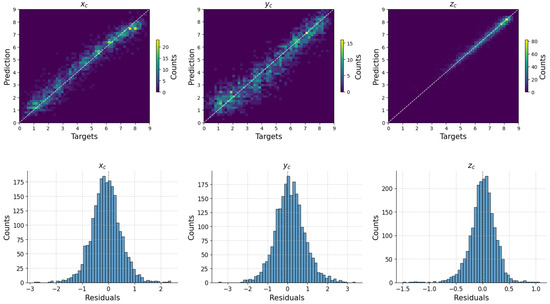 Output of the energy centroid network for the x, y, and z coordinates. The plots show the correlation between targets and predictions (above) and the residuals (below).
