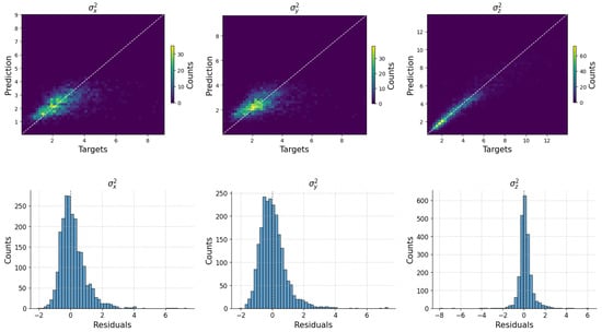 Output of the energy dispersion network for the x, y, and z coordinates. The plots show the correlation between targets and predictions (above) and the residuals (below).