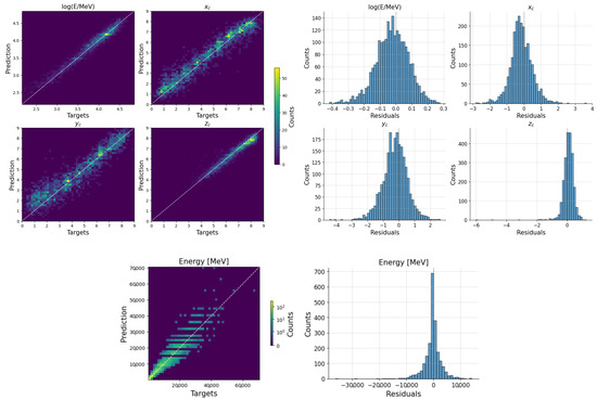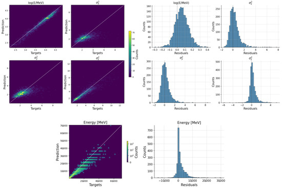 Output of the energy deposition and dispersion network. The plots show the correlation between targets and predictions (left) and the residuals (right).