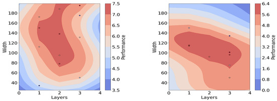 Posterior distribution of network performance on log(E/MeV) and centroid (left) and log(E/MeV and dispersion (right) for multi-target regression as a function of the layers and width per layer, having set and .