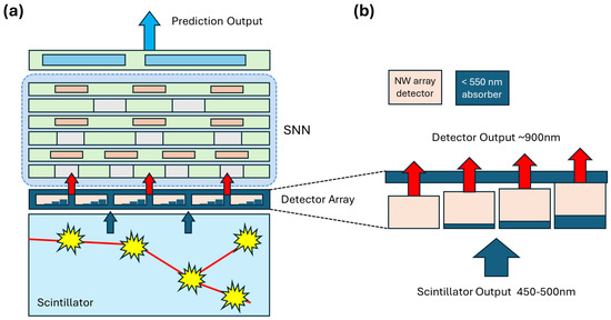 A layered system of arrays of NW components organized in a suitable geometry, where the bottom layer absorbs the incident scintillator light and the top layer serves as the output of the processed information, can be considered a trainable neuromorphic system. Referring to such a system in Figure 12a, we first turn to the light detectors. Here, four detectors in each pixel should be constructed that sequentially have an order of magnitude different sensitivity, as described in Equation (4). A suitable NW neuron architecture has one phototransistor for excitation coupled with an NW FET and NW LED emitter [17]. When sufficient light hits the phototransistor, the LED starts to emit. A simple way to achieve different thresholds on the four different phototransistors is to place scintillator-light absorbing GaInP layers of varying thickness between the scintillator and respective NW detectors. As 1 µm thick GaInP will be enough to completely absorb the scintillator light output and absorption decreases exponentially, varying thickness can be directly used to obtain the required orders of magnitude of difference. A representative design is shown in Figure 12b. Operating the NW LED emitter at lower energies (such as by using InP) can ensure that the signal output from the detector neuron will not be absorbed by the GaInP and reach the SNN. The operating timescales will be determined by the sensing and emission components of the neuron. The signal transmission travels at the speed of light and can be assumed to be instantaneous at these length scales (light travels 1 µm in ∼3 fs). Although the phototransistor risetime is ∼10 ps, the longer NW LED risetime of ∼100 ps sets the speed of the system. This response time is sufficient for the time window required in the present study.
