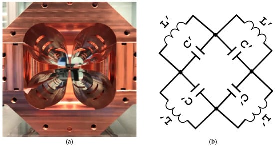 Radio-frequency quadrupole (RFQ) designed and built at IZPILab Beam Laboratory: (a) A RFQ cold model’s clover-like transversal section: (a) Description of what is contained in the first panel; (b) Equivalent lumped-component approximation.