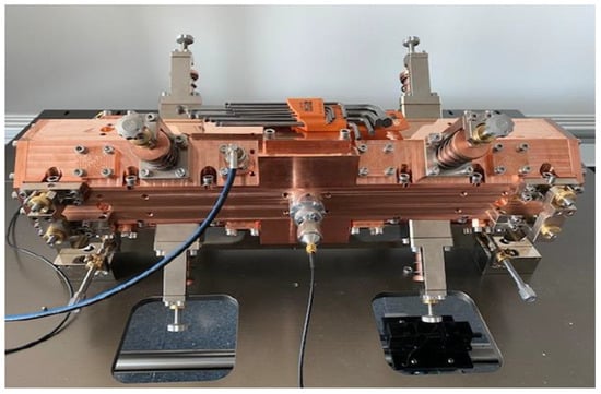 Typical proton RFQs use a frequency in the range from 300 to 400 MHz such as, for instance, the 324 MHz FETS RFQ at RAL [3] or the 352.2 MHz LINAC4 RFQ developed at CERN as a part of the LHC injector [4]. The use of higher frequencies allows for the reduction of the RFQ size at the expense of acceleration efficiency. In 2016, CERN built the first compact proton RFQ at 750 MHz [5]. The final RFQ for our project is also intended to work at 750 MHz and provide proton acceleration from 30 keV to 4.5 MeV in a compact 1.5 m long structure [6,7]. As proof of concept, to check the design procedure and to study mechanical feasibility, a cold model was built, which is a shorter version (0.5 m) intended to work at low power (mW) and without a vacuum (Figure 2).