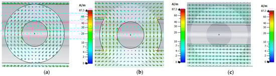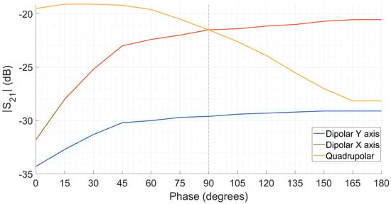 As there are two ports to inject the signal, a degree of freedom exists, which is the relative phase between them. If the phase is the same, the symmetry with the quadrupolar mode (Figure 7) is maximum. However, as the phase difference increases, the coupling with the dipolar modes (Figure 5 and Figure 6), in which they are completely out of phase, increases. This result is found experimentally in Figure 11, and it agrees with simulations. Moreover, halfway between being in phase and out of phase, at 90°, the excitation amplitude of the dipolar mode X and the quadrupolar mode become equal.