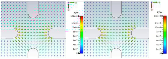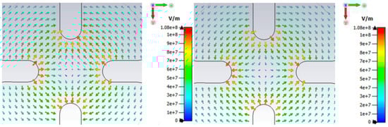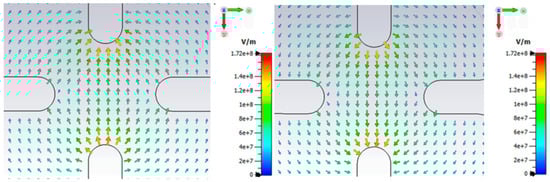 The third mode (TE210) is the one with quadrupole symmetry (Figure 7), which acts in both axes and has the correct shape for confining the beam. It alternates focusing periods in the X and Y direction along the length of the RFQ, providing a purely electrical focus. At higher frequencies, one can find the same three modes (dipolar Y, dipolar X, and quadrupolar) repeated as harmonics. In these modes the field intensity changes as length increases, becoming zero at the nodes. The most problematic modes are the harmonics of the dipolar modes, which lay close (+/−10%) to the main quadrupolar mode, and can overlap with it, especially if the structure is long. The reason being that the frequency of the harmonics decreases as the length increases. The coupling solution can be tested through frequency domain simulation, injecting the signal from the coaxial cables to the RFQ through the ports and implementing a direct coaxial-like electric coupling (Figure 3).