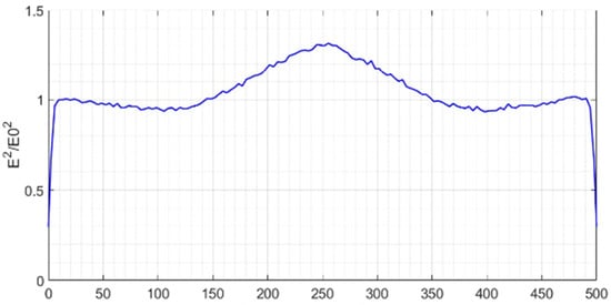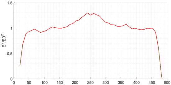 Profile of the normalized electric field measured along the structure determined in one lobe close to the axis (position is in mm).