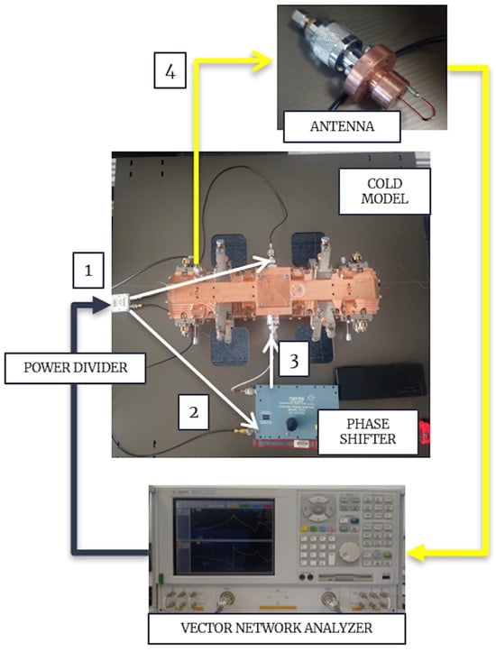 In order to check the appearance of the different modes, as well as their excitation amplitude, a setup is arranged like in Figure 9. The signal from a VNA (Vector Network Analyzer) is divided into two signals with equal amplitudes. One of them goes through a variable phase shifter, which allows control of the relative phase between the two RFQ input ports, and the other is connected directly. Finally, the signal is picked, employing an antenna located near the beginning of the structure. This picked signal goes back to the VNA.