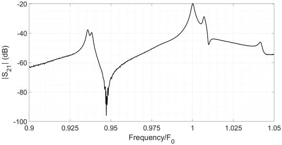 The mode separation between the dipolar TE110 modes and the quadrupolar mode has been found to be around 45 MHz. Regarding some other measured higher order modes in Figure 10, the most significant observations were found at around 1.1f0, with an amplitude that was 15 dB lower than the quadrupolar one, and even further at 1.74f0 with an associated amplitude similar to the fundamental quadrupolar mode.