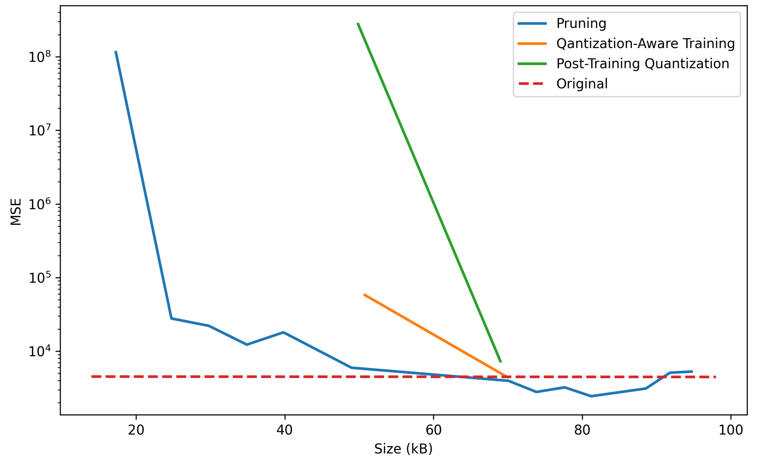 The model is a neural network comprising eight convolutional layers, alternated by eight max pooling layers, and followed by two dense layers. The model employs the tanh activation function, the Huber loss function, and the Adam optimiser with a learning rate of 0.0001. We used the Mean Squared Error (MSE) to evaluate the model’s performance. Then, we measured the MSE of the model as a function of its size (kB) after applying optimisation techniques. The results are shown in