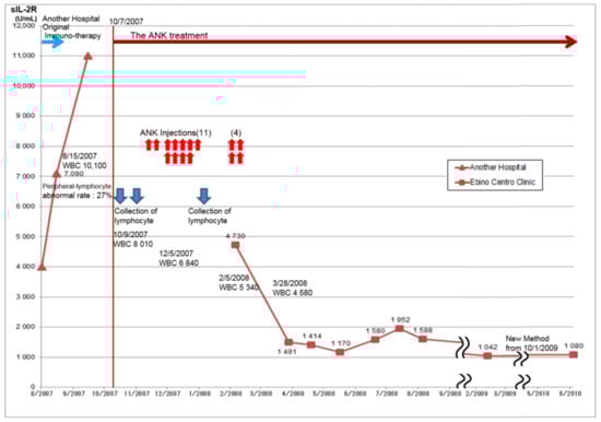 Soluble IL-2 receptor (sIL-2R) levels in the serum of the patient. Due to the gradual increase of the levels, ANK cell treatment was initiated. After repeated injections of ANK cells, sIL-2R levels decreased. The red arrow indicates an injection associated with ANK cell treatment. The blue color indicates venous blood collection for the ANK cell culture. The typical range of sIL-2R was 190–650 U/mL before 1 October 2009, and thereafter shifted to 122–496 U/mL.