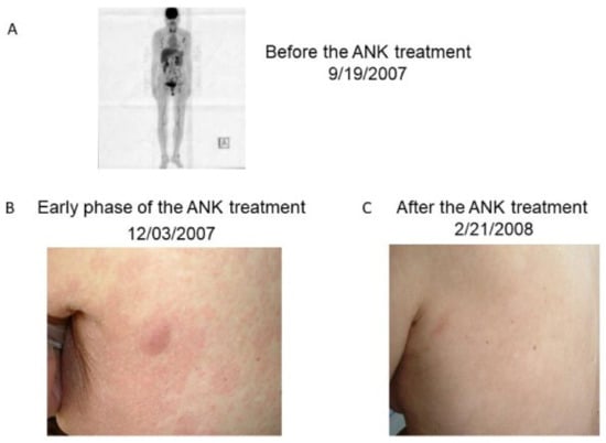 A positron emission tomography-computed tomography (PET-CT) image (before the ANK cell treatment) and skin lesions of the patient. (A) PET-CT revealed the enlargement of multiple lymph nodes before ANK cell treatment; (B) She had a rash and tumors on her whole body in the early phase of ANK cell treatment (3 December 2007); (C) After the repeated administration of ANK cells, she was cured of multiple skin lesions (21 February 2008).