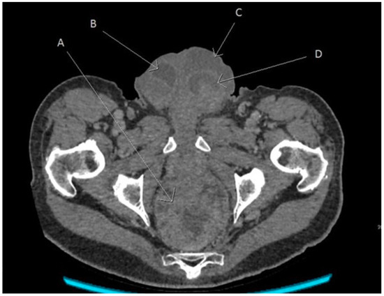 Angled axial reconstruction computed tomography image of abdomen and pelvis showing the rectal tumour, scrotal collection, and bilateral hydrocoeles. A—Rectal tumour, B—Right hydrocele, C—Left scrotal collection, and D—Left hydrocele.