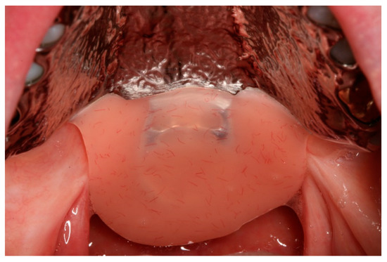 As for all patients with prostheses, oral hygiene and denture hygiene are essential. Plaque accumulation on the prosthesis can increase the risk of dental caries and periodontal disease [19] and poor denture hygiene can lead to denture stomatitis [19]. This risk of denture stomatitis is increased when patients fail to remove their prosthesis at night [20]. In this case, the risk of denture stomatitis was accepted as CH needed to wear the prosthesis full-time to restore her velopharyngeal function. The application of topical Miconazole gel along with thorough denture hygiene is proving successful.