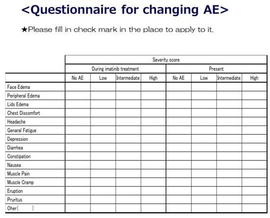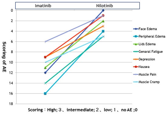 Chronic myeloid leukemia (CML) is characterized by the translocation between the 9th chromosome and the 22nd chromosome. The treatment of CML has dramatically changed by tyrosine kinase inhibitors (TKIs). Furthermore, outcomes in patients with CML in chronic phase has been improved []. Several adverse drug events (ADEs) related to TKI in CML patients are common, including general edema, nausea, fatigue, and musculoskeletal symptoms. It has been reported that ADEs had a negative influence on their daily quality of life (QoL). However, new ADEs developed once imatinib (IM) was switched to nilotinib (NILO); therefore, early and successful management of ADEs is required for the acquisition of tolerance to treatment []. The ADEs (peripheral edema, muscle spasm, and eruption) that occurred at the beginning of IM treatment disappeared after switching to NILO [].