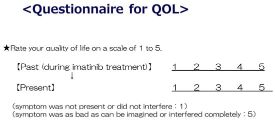 An interview form for quality of life (QoL) was prepared for all patients. QoL was judged on a scale 1 to 5 during imatinib (IM) treatment (in the past) and during nilotinib (NILO) treatment (in the present).