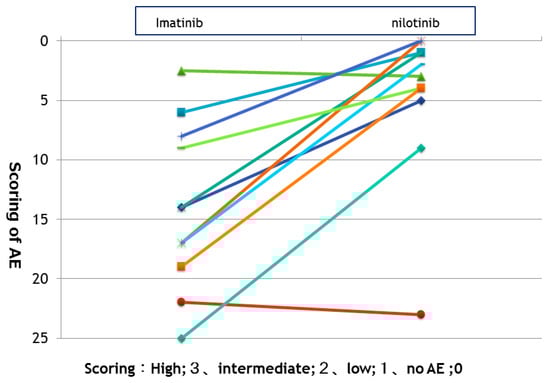 A questionnaire survey (Figure 1), which included 14 adverse events, was carefully carried out by calculating system. After switching from IM to NILO, the total number of AEs decreased in most cases, except in 2 (Figure 3). New AEs developed upon switching to NILO; however, tolerance was gradually acquired by management of AE.