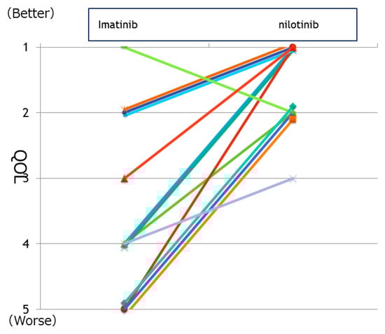 Adherence is compliance with a medication regimen and is based on patient understanding, decision-making, and therapeutic cooperation. Adherence is defined by various factors. It has been reported that drug adherence has been reported as a critical factor for achieving molecular response in patients with CML [,,,], and non-adherence to TKI therapy may influence the disease outcome []. In this study, we evaluated drug adherence using the 9-item Morisky Medication Adherence Scale (MMAS) [,]. We compared drug adherence rates between patients using IM and those who switched from IM to NILO, a second-generation TKI. Drug adherence determined with 9-item MMAS was improved significantly in the NILO group compared IM group. Guérin et al. [] reported that among the patients treated with second-line TKIs, those treated with NILO had a significantly higher adherence compared to patients treated with dasatinib. However, Trivedi et al. reported that among the second-line TKI-treated CML patients, dasatinib patients had significantly higher adherence and lower discontinuation rates compared with those receiving second-line nilotinib []. Chen et al., however, raised some questions about the results described above []. In general, social, disease-related, treatment-related, and patient-centered factors contribute to improved adherence [,]. However, no significant differences in adherence, hospitalization, or emergency room visits have been reported among patients initiating a second vs first-generation TKI []. Marin et al. reported that no complete molecular responses were observed when adherence was ≤90%, and no major molecular responses were observed when adherence was ≤80%; the adherence rate for each patient was defined as the dose taken according to the microelectronic monitoring systems (MEMS) reading and expressed as a percentage of the dose prescribed during the total duration of the study []. We, therefore, examined the relationship between clinical outcome using the international scale (IS) for BCR/ABL and clinical adherence determined by MMAS. This study aimed to evaluate patient-reported ADEs during TKI treatment and their influence on adherence and QoL in CML patients in chronic phase.