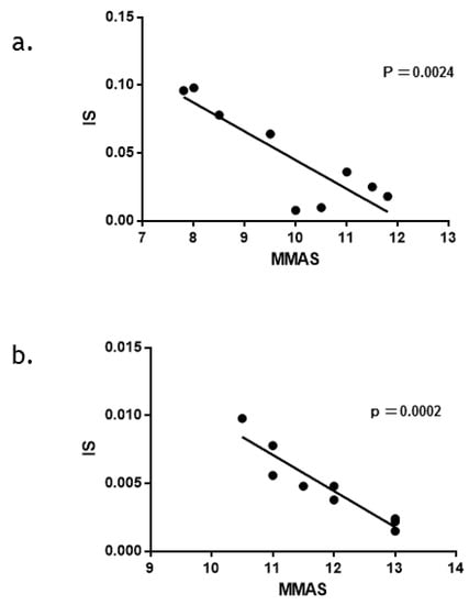 Relationship between drug adherence rates and clinical outcome determined with IS. Drug adherence was measured by Morisky’s 9-item Medication Adherence Scale (MMAS). A more significant relationship between those evaluated parameters was found in the NILO group (p = 0.0002) (Figure 6a) than in the IM group (p = 0.0024) (Figure 6a). The straight line has a steeper slope in NILO group than IM group. Figure 6 divided into a and b. As shown in Figure 6 legend, Figure 6a showed relationship between drug adherence rates and clinical outcome determined with IS in IM group, and Figure 6b showed that in NILO group.
