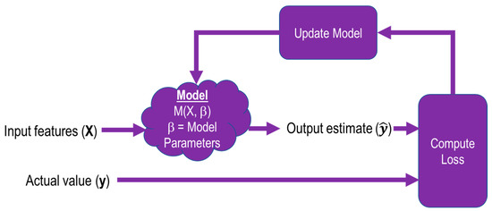 During the training process shown in Figure 2., images X from the training dataset are fed into the model M, which is defined by its parameters β. The output of the model is compared with the training label that corresponds to the input image, the loss is computed, and the model is updated with new parameters.