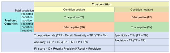After training, the models were tested using the test data, which the models have never seen before, and accuracy, sensitivity (recall), specificity, precision, and F1 score were calculated.