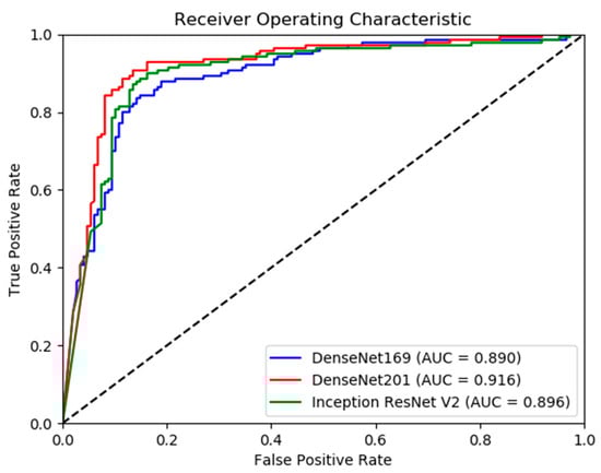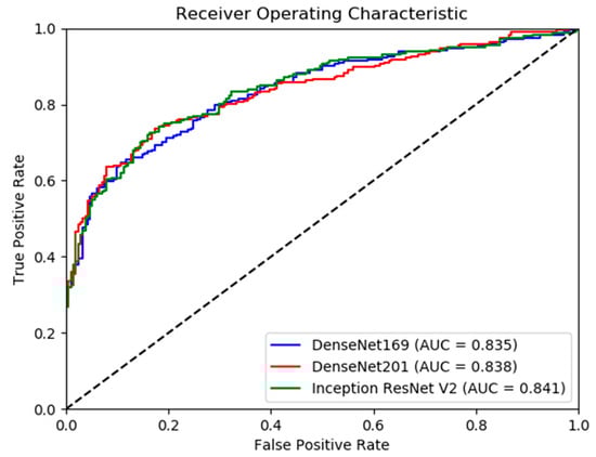 Rajpurkar et al. [] used a 169-layer Dense Convolutional Network architecture (DenseNet-169) [] to predict the probability of abnormality for each image in their MURA dataset study. This study implements DenseNet-169, DenseNet-201, and InceptionResNetV2 [,,] deep learning models pre-trained on ImageNet. These architectures were selected because of their high recognition accuracy in the benchmark study by Bianco et al. []. Initial layers of deep learning networks capture generic features, while later ones focus on task–specific features. By using weights from ImageNet to pre-train the models, we leverage previous learning of generic features captured in the initial layers and reduce the training data need. The architectures used in this study utilize model parameters more effectively and use less data for training than other architectures and have a lower tendency to overfit to training data [].
