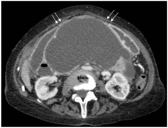 - Hsu, C.-Y.; Lee, K.-C.; Chan, C.-C.; Lee, F.-Y.; Lin, H.-C. Gastric Necrosis and Perforation as a Severe Complication of Pancreatic Pseudocyst. J. Chin. Med. Assoc. 2009, 72, 603–606. [Google Scholar] [CrossRef]