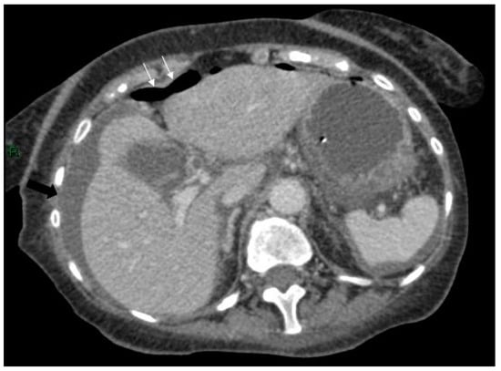 Axial CT scan of the abdomen showing free air anterior to the liver (white arrows) and free fluid around the liver and spleen (black arrows).