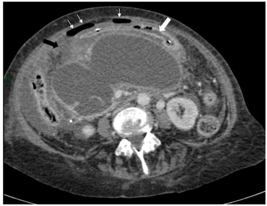 Initially, Axial CT scan showing the stomach containing a nasogastric tube anterior to the cyst (large white arrow), free air (small white arrows) and inflammatory changes in the soft tissues between the stomach/duodenum and the cyst (black arrow).