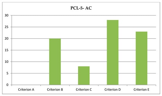 The PCL-5 is a self-report measure which assesses the 20 symptoms of PTSD. The meter has a variety of purposes, including making a provisional diagnosis of PTSD, screening individuals for PTSD, and monitoring symptoms during and after treatment. PCL-5 can be completed by participants as part of a research study. The PCL-5 has excellent psychometric properties, high internal consistency, and adequate convergent validity. In this case study both scoring modes were used; the sum of the 20 questions score (with a cut point of 33) and the coverage of the diagnostic criteria (A, B, C, D, E) [,].