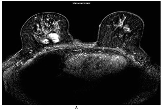 In breast pathology, FS is very sensitive, ensuring the diagnosis of malignancy without false positive results [,] in almost all cases. In our case report, both screening mammogram and diagnostic MRI (to clarify mammogram findings) revealed an abnormal finding of the breast, giving a BI-RADS 4C in the final conclusion. However, based on the lack of randomized clinical trials showing a benefit of presurgical breast MRI in overall survival, its integration into breast surgical operations remained debatable []. Furthermore, preoperative MRI for staging women with breast cancer does not reduce the risk of local or distant recurrences []. It could be claimed that the use of preoperative MRI is controversial. Actually, while prior studies indicated limited benefit of preoperative MRI, emerging evidence demonstrates lower odds of positive resection margins and lower odds of repeat surgery in patient groups undergoing preoperative breast MRI. In particular, from a clinical trial (involving authors from Yale School of Public Health and the Department of Surgery, University of Minnesota Medical School) involving more than 45,000 women having early stage breast cancer (with more than 9000 DCIS), it was concluded that in older women, preoperative breast MRI does not reduce the incidence of multiple surgeries []. However, from a recent study (involving authors from the University of Ulsan College of Medicine, Gangneung, Korea) involving less than 550 women, it was concluded that preoperative MRI reduced positive resection margins and repeat surgery for DCIS []. Considering that the authors of the latter study are deriving exclusively from two Departments of Radiology, a possible bias cannot be excluded.