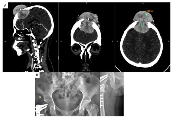 (A) Head CT-scan demonstrated a skull lesion in the frontal region with the overlying lytic bone lesion. (B) Pelvic X-ray showed multiple lytic lesions at the proximal right femur and internally fixated pathological femoral neck fracture from the previous hospital treatment.