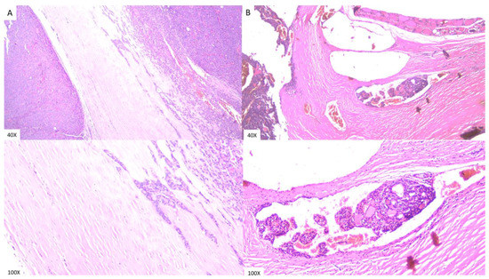Histology examination revealed that the tumor was arranged in variably-sized follicles containing colloid with capsular invasion (A) and vascular infiltration (B). The cancer cells consisted of polymorphic cells with nuclear enlargement and hyperchromasia.