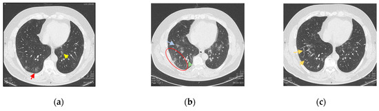 Computed tomography (CT) findings of the patient’s lungs at days 0, 3, and14. (a–c) CT images of the patient’s lungs at day 0 (a), day 3 (b), and day 14 (c). Red and yellow arrows in (a) indicate bilateral ground-glass opacities (GGOs) with a peripheral and posterior predominance, respectively. Red circle in (b) indicates an increased number of bilateral GGOs that are widespread in the lungs. Blue and green arrows in (b) indicate a reticular pattern and the appearance of dilated vessels, respectively. Orange arrows in (c) indicate GGOs that have shrunk, changed into a small consolidation, or developed a cord-like appearance.
