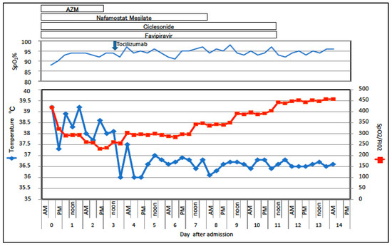 Fluctuations of the patient’s oxygen saturation (SpO2), body temperature, and SpO2/FIO2 ratio during his hospitalization. The drug dosing period is shown at the top of the figure.