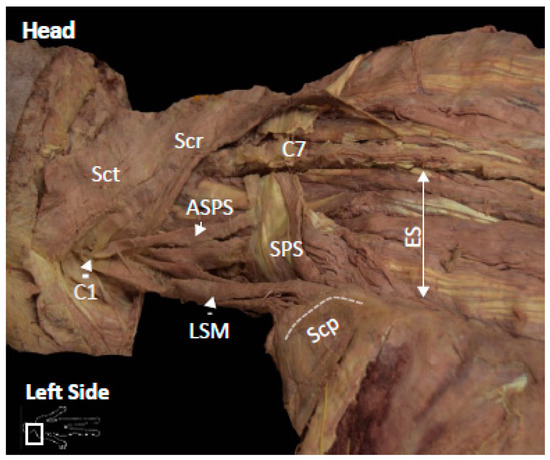 Overview of the Posterior Intermediate/Deep Neck. Accessory Serratus Posterior Superior (ASPS) Muscle; Atlas transverse process (C1); Spinous process of cervical vertebra 7 (C7); Erector Spinae (ES) Muscles; Levator Scapulae Muscle (LSM); Scapula (Scp); Serratus Posterior Superior (SPS) Muscle; Splenius capitis (Sct) Muscle; Splenius cervicis (Scr) Muscle.