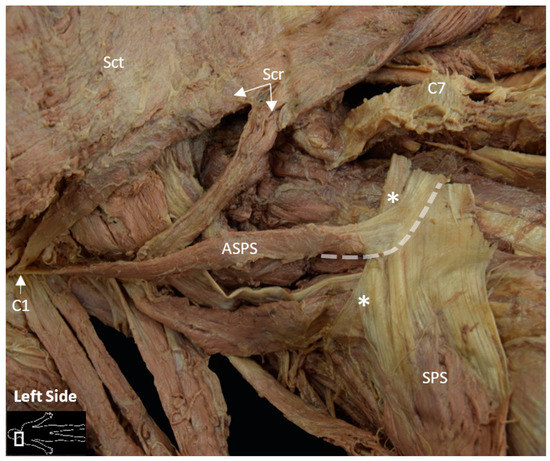 Origin and Insertion Sites for ASPS. The dashed line illustrates the slightly perpendicular insertion of the ASPS onto the proximal portion of the SPS. Asterisks indicate the upper tendinous connection of the SPS traveling deep to the ASPS. Accessory Serratus Posterior Superior (ASPS) Muscle; Atlas transverse process (C1); Spinous process of cervical vertebra 7 (C7); Serratus Posterior Superior (SPS) Muscle; Splenius capitis (Sct) Muscle; Splenius Cervicis (Scr) Muscle.