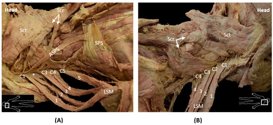 In combination with this rare finding, there were some noteworthy differences in the cervical origins of the left LSM compared to the right. The left sided LSM exhibited four main muscular slips with distal attachments to the superior angle of the scapula but varied in the number of muscular slips and cervical origins. The observed variabilities of the left LSM are as follows: (1) muscular slips 1 and 2 shared a common cervical origin at C1; (2) the third, broader muscular slip, bifurcated midway, with one muscular slip of cervical origin at C3 and the other at C4; and (3) the fourth muscular slip originated from C5; no LSM muscle slips originated from C2 (Figure 3A). The right-sided LSM had four muscular slips that originated from the transverse processes of C1–C4 vertebrae, respectively, and were relatively consistent in size and shape (Figure 3B). The muscular asymmetry in the present case produced a five-headed left LSM and a four-headed right LSM.
