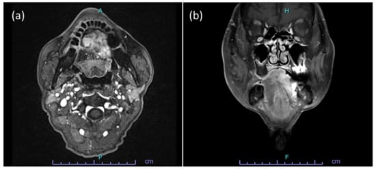 Radiographic findings of the tumor. (a,b) The tumor localized in the body of the tongue and occupied more than half of the tongue. The cervical lymph node is not enlarged.