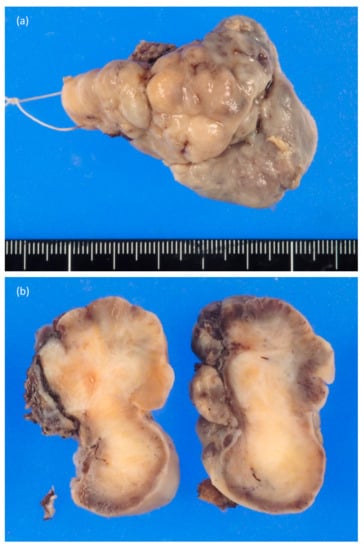 Gross findings of the resected material. (a) The tumor was raised mass with a bumpy surface. (b) The cut surface of the tumor was solid, white to yellowish-brown, and brown near the surface.