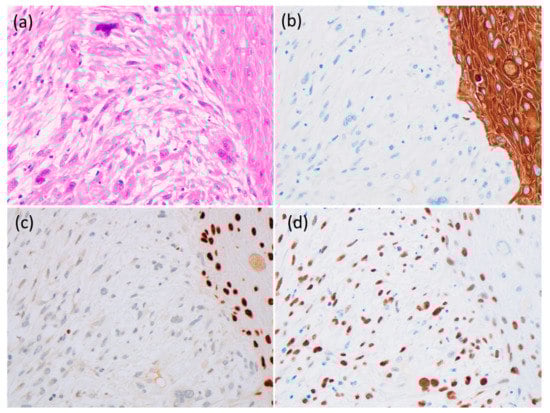 - Ansari-Lari, M.A.; Hoque, M.O.; Califano, J.; Wsetra, W.H. Immunohistochemical p53 Expression Patterns in Sarcomatoid Carcinomas of the Upper Respiratory Tract. Am. J. Surg. Pathol. 2002, 26, 1024–1031. [Google Scholar] [CrossRef] [PubMed]